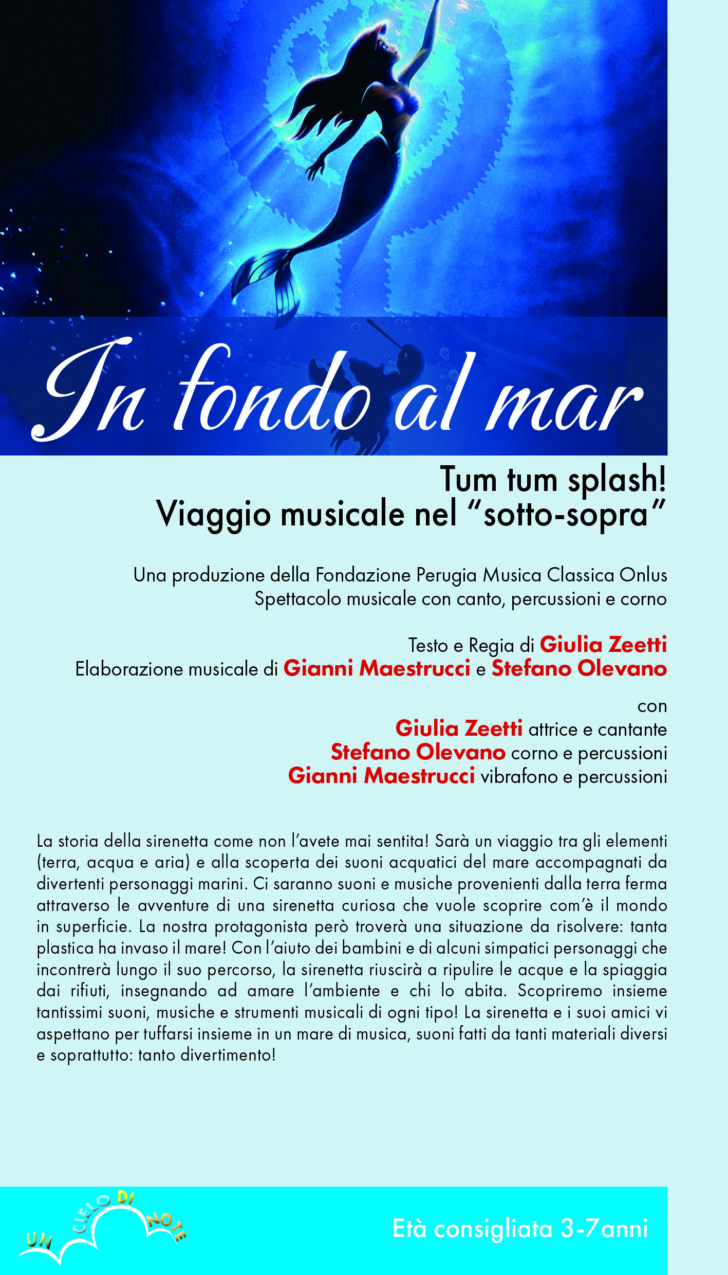 Gli appuntamenti delle «Mattinate Musicali» si svolgeranno da gennaio ad aprile 2026 presso il Teatro Brecht ed in altri teatri della città e della provincia di Perugia. Nellarco della stessa mattina sono previsti due concerti: per “IN FONDO AL MAR” alle 9.15 e alle 10.45 mentre per “ALICE e PICCOLE DONNE” alle ore 9.30 e alle ore 11.00. Gli spettacoli musicali durano generalmente circa 60 minuti. - Il costo del biglietto per spettacolo è di € 5,00 cadauno (biglietto omaggio per i docenti e accompagnatori)