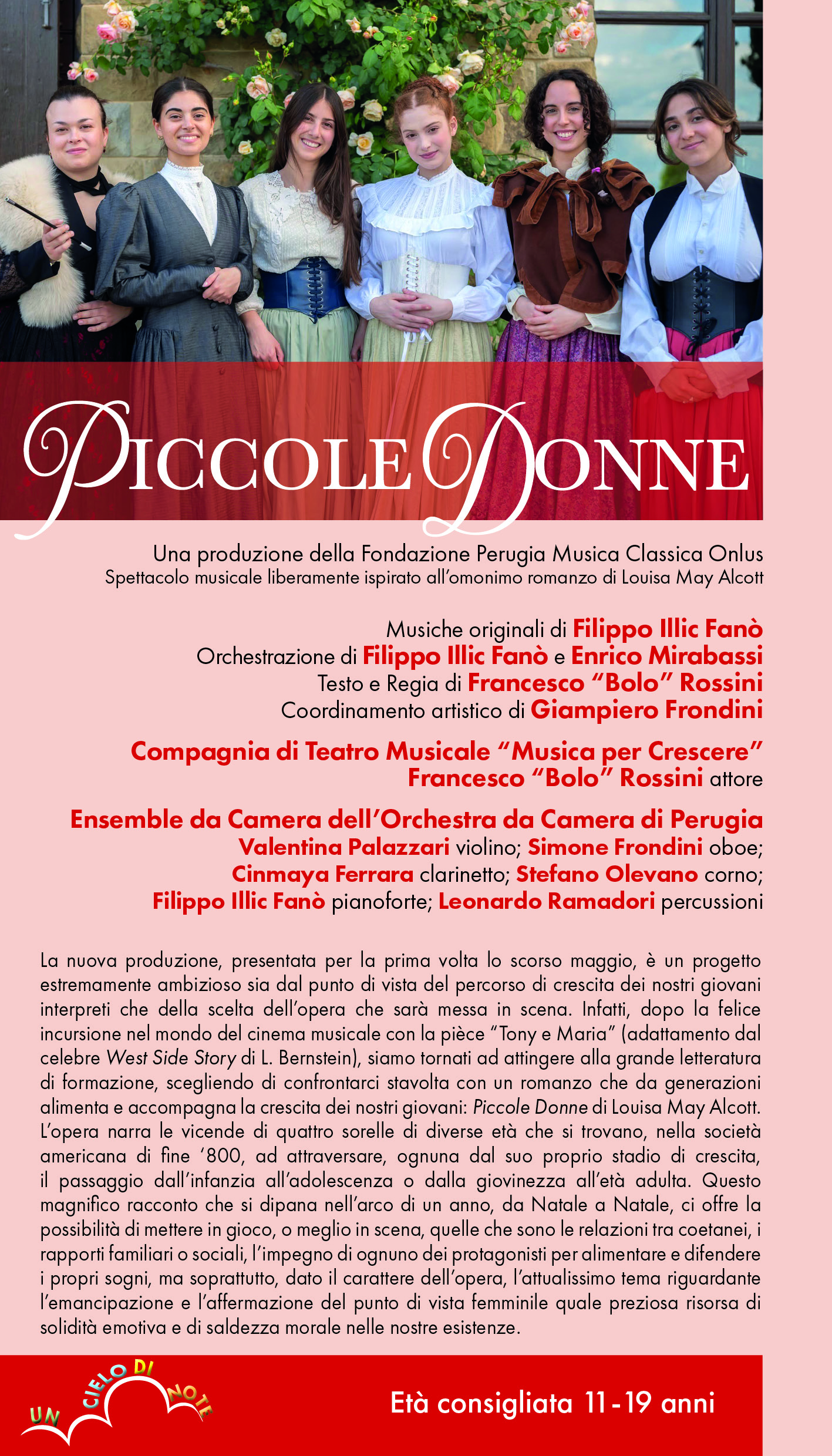 Saranno tre le nuove bellissime produzioni che vi aspetteranno nei vari teatri della nostra regione. Come sempre ce ne sarà una rivolta ai più piccoli della scuola dell’infanzia e per il primo ciclo della scuola primaria dal titolo “IN FONDO AL MAR”, in cui insieme a Stefano (corno), Gianni (percussioni) e Giulia (attrice e cantante) ci immergeremo nelle acque profonde, per poi riemergere sulla terra ferma scoprendo le divertenti avventure musicali di una curiosa sirenetta. Ci sarà poi un viaggio che i bambini della scuola primaria e del primo ciclo della scuola secondaria di primo grado taranno insieme a Simone (oboe), Sterano (corno), Leonardo (percussioni) e Debora (attrice e clarinetto) e soprattutto insieme ad “ALICE” nell’immenso e magico mondo della musica, incontrando personaggi buffi, rumorosi e spesso fuori dal comune. Infine, per le scuole secondarie di primo e secondo grado, non vediamo l’ora di presentarvi “PICCOLE DONNE” , che vedrà ancora una volta protagonista la giovanissima Compagnia di Teatro Musicale di “Musica per Crescere” con le musiche originali di Filippo Illic Fanò e la drammaturgia e la regia di Francesco “Bolo” Rossini.